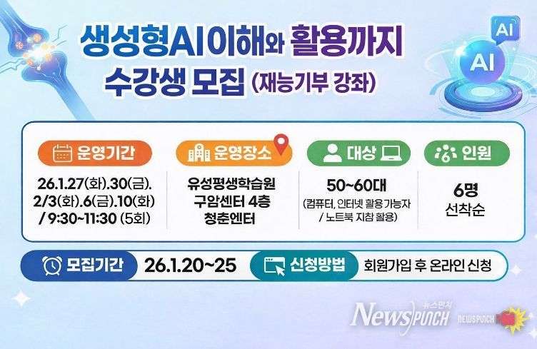뉴스펀치 이현승 기자 | 대전 유성구는 1월 27일부터 2월 10일까지 구암평생학습센터 4층 청춘엔터에서 ‘재능기부형 생성형 AI(인공지능) 교육 과정’을 운영한다.