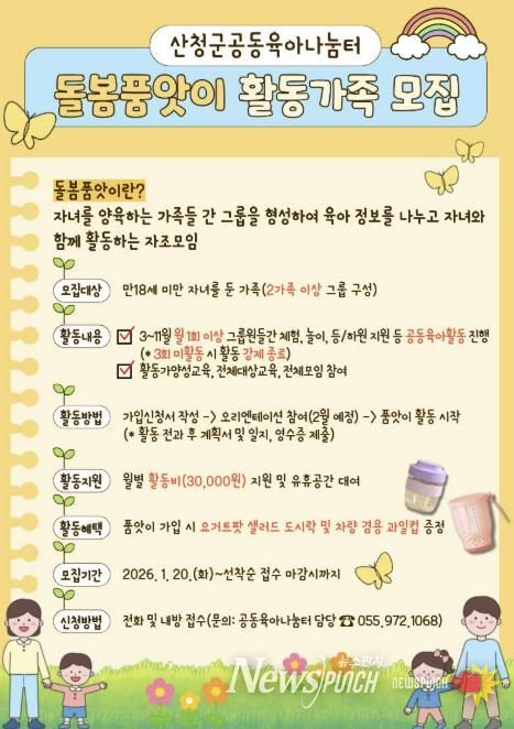 뉴스펀치 박세훈 기자 | 산청군가족센터는 20일 공동육아나눔터 운영 일환으로 돌봄품앗이 활동 가족을 모집한다고 밝혔다.