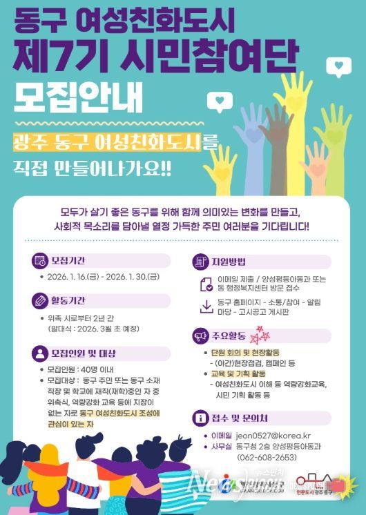 뉴스펀치 김용희 기자 | 광주 동구는 주민이 직접 참여해 여성친화도시 정책을 만들어가는 ‘제7기 동구 여성친화도시 시민참여단’을 이달 30일까지 모집한다고 밝혔다.