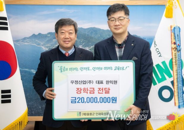 뉴스펀치 박세훈 기자 | 지난 20일 화요일 오전 9시, 울릉군청을 방문한 우정산업(주)는 (재)울릉군인재육성재단(이사장 남한권)에 장학금 2,000만 원을 기탁했다.