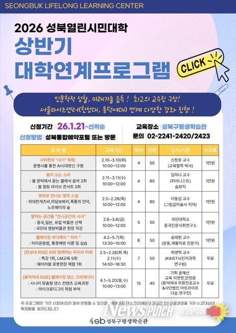 뉴스펀치 박상훈 기자 | 서울 성북구가 2월부터 5월까지 구민을 대상으로 ‘2026 상반기 열린시민대학’을 운영한다.