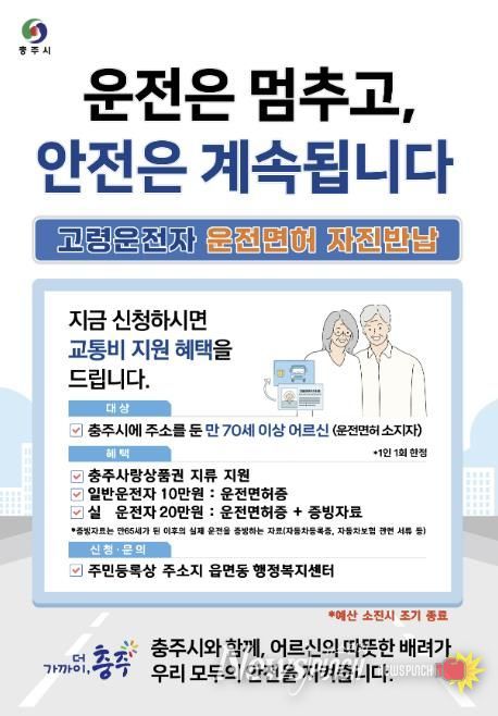 뉴스펀치 이현승 기자 | 충주시는 고령운전자의 교통사고 예방과 안전한 교통환경 조성을 위해 시행 중인 고령운전자 운전면허 자진반납 제도의 인센티브를 2026년부터 확대 시행한다고 21일 밝혔다.