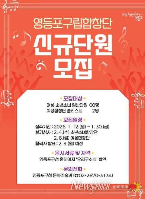 뉴스펀치 박상훈 기자 | 영등포구가 지역 문화 예술을 함께 이끌어 갈 영등포구립합창단 신규 단원을 오는 30일까지 공개 모집한다고 밝혔다.