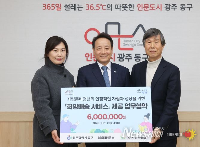 뉴스펀치 김용희 기자 | 광주 동구는 지난 20일 (유)대영운수(대표 김정진), (사)자비신행회와 함께 자립 준비청년의 안정적인 사회 정착을 돕기 위한 ‘희망배송 서비스’ 업무협약을 체결했다고 밝혔다.