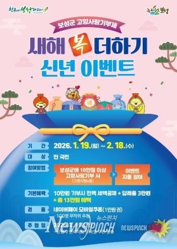 뉴스펀치 김용희 기자 | 보성군은 2026년 새해를 맞아 고향사랑기부제 참여를 확대하고 기부 문화를 활성화하기 위해 오는 2월 18일까지 ‘새해 복 더하기 신년 이벤트’를 추진한다고 밝혔다.