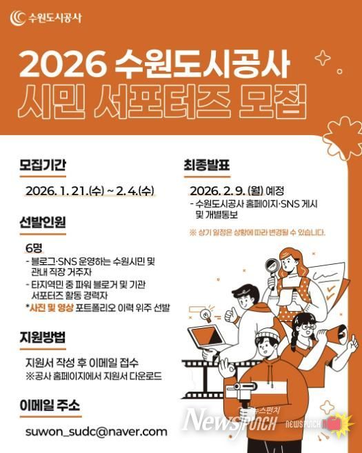 뉴스펀치 박상훈 기자 | 수원도시공사가 21일부터 다음 달 4일까지 2026년도 제8기 시민 서포터즈를 모집한다.