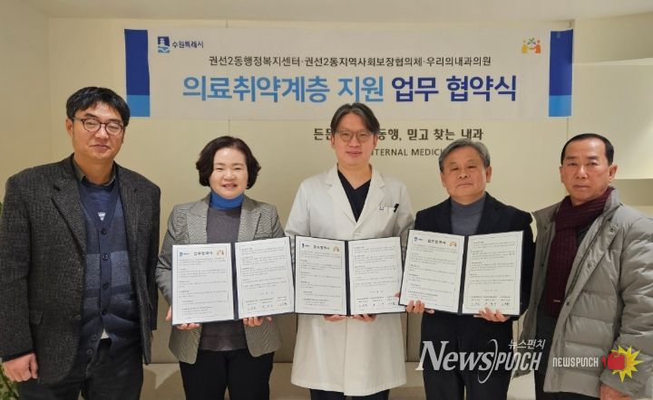 뉴스펀치 박상훈 기자 | 수원시 권선구 권선2동행정복지센터는 지난 20일, 권선2동 지역사회보장협의체, 우리의내과의원과 함께 지역 내 취약계층 의료복지향상 위한 업무협약을 체결했다고 밝혔다.