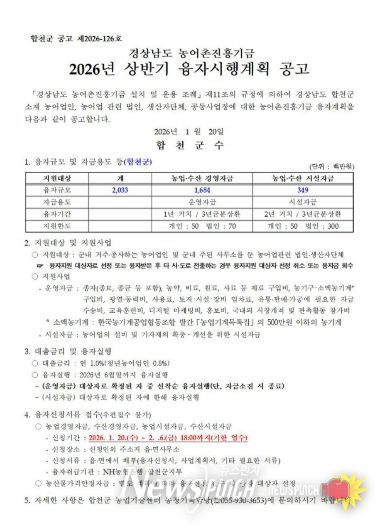 뉴스펀치 박세훈 기자 | 합천군은 1월 20일부터 2월 6일까지 경상남도 농어촌진흥기금 융자 신청을 읍·면사무소에서 접수한다.