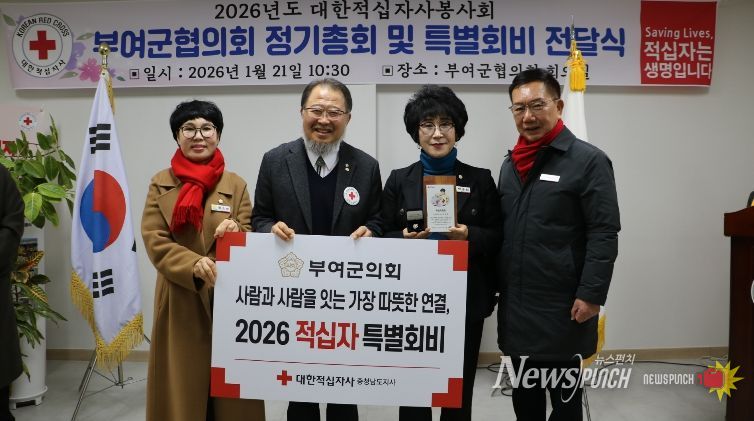 뉴스펀치 이현승 기자 | 부여군의회는 21일 대한적십자사봉사회 부여군협의회 정기총회에서 2026년도 대한적십자사 특별회비 전달식을 가졌다.