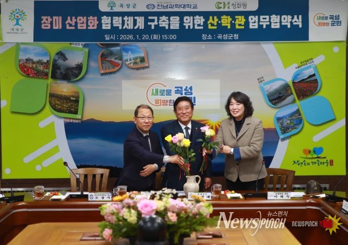 뉴스펀치 김용희 기자 | 전남 곡성군은 장미산업화의 본격적인 추진을 위해 지난 20일 군청 소통마루에서 전남과학대학교, 주식회사 청화팜(대표 이화숙)과 함께 ‘곡성군 장미산업화 및 RISE 연계 산·학·관 협력체계 구축을 위한 업무협약’을 체결했다고 21일 밝혔다.