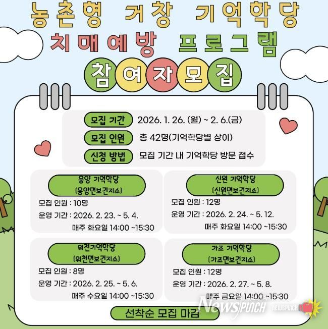 뉴스펀치 박세훈 기자 | 거창군 치매안심센터는 지역 주민의 인지건강 증진과 치매 예방을 위해 상반기 농촌형 거창 기억학당 치매예방 프로그램 참여자를 모집한다고 22일 밝혔다.