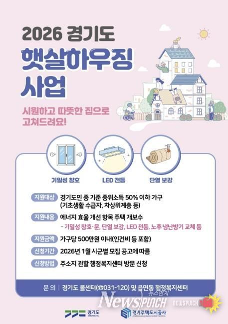 뉴스펀치 박상훈 기자 | 의왕시가 저소득 가구의 난방비 및 전기료 부담을 줄이고 주거 안정을 도모하기 위해 ‘경기도 햇살하우징 지원사업’ 신청을 2월 19일까지 받는다.