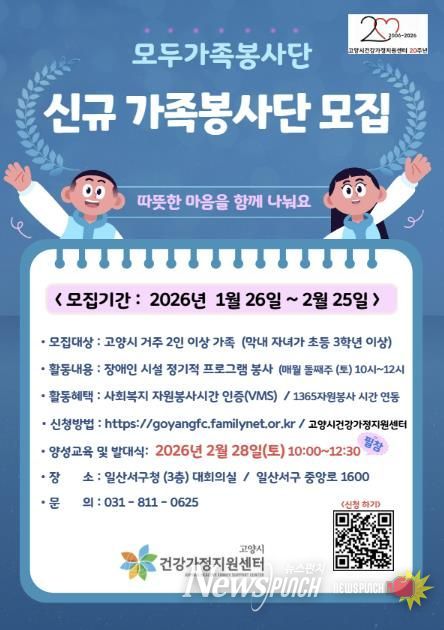 뉴스펀치 박상훈 기자 | 고양특례시 건강가정지원센터에서는 오는 2월 25일까지 2026년 ‘가족봉사단’참여자를 모집한다.