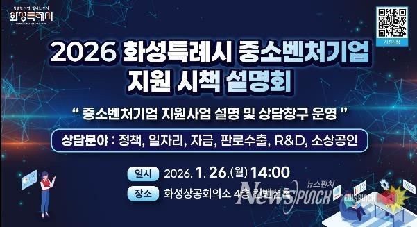 뉴스펀치 박상훈 기자 | 화성특례시가 관내 중소기업과 소상공인의 경영 애로 해소와 지원사업 활용도를 높이기 위해 오는 26일 화성상공회의소 컨벤션홀에서 ‘2026년 화성특례시 중소벤처기업 지원 시책 설명회’를 개최한다.