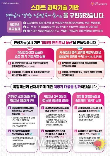 이번 주요 사업의 핵심 내용은 ▲재난안전산업 기반(인프라) 조성 및 인공지능(AI) 기술 개발·실증 ▲울산시-울산대 협력 고위험 복합재난 대응 안전교육 기반(플랫폼) 구축 ▲기후위기 선제 대응을 위한 복합재난 예방체계 구축 ▲사회재난 신속 대응 및 국가산단 안전관리 고도화 ▲철저한 예방을 통한 중대재해 ‘제로(ZERO) 실현’이다.