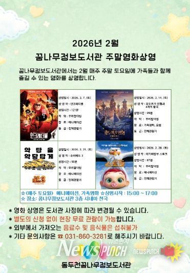 뉴스펀치 박상훈 기자 | 동두천시 도서문화사업소 정보도서관은 2월 한 달간 매주 토요일 어린이와 가족을 대상으로 애니메이션 및 가족영화 4편을 상영한다고 밝혔다.
