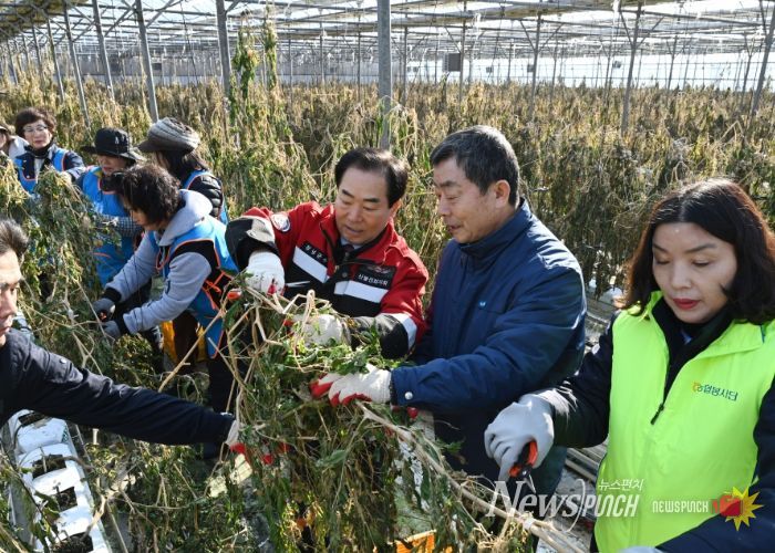 이날 자원봉사자들은 전국적인 한파 특보 속에서 피해 농가의 빠른 복구를 돕기 위해 시설하우스 내 방울토마토 고사주 정리와 수확 잔여물 처리 등을 하며 구슬땀을 흘렸다.