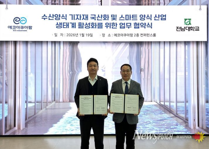 뉴스펀치 김용희 기자 | 전남대학교 스마트수산양식연구센터(센터장 김태호 교수)가 에코아쿠아팜(주)와 스마트양식 분야 기술협력 및 인력양성 강화를 위한 업무협약을 체결했다. 업무협약식은 19일 부산 에코아쿠아팜(주) 2층 컨퍼런스 홀에서 진행됐다.