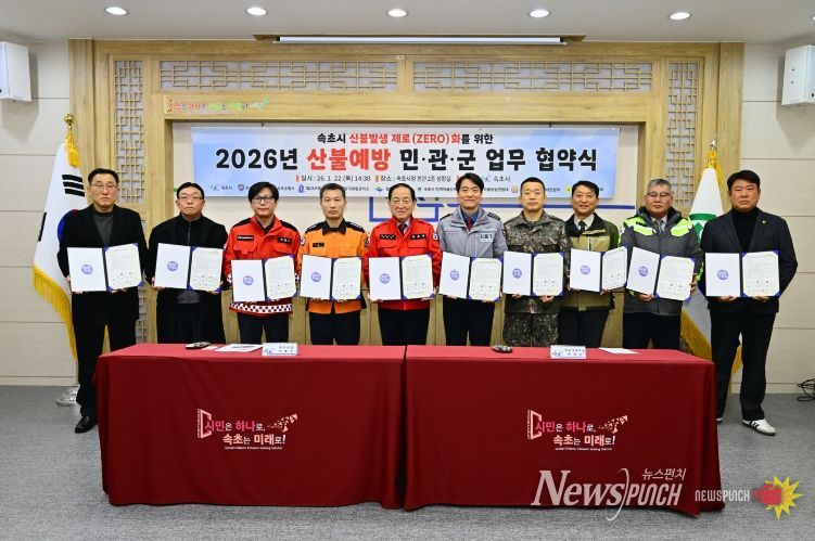 시는 1월 22일, 시청 상황실에서 10개 기관·단체가 참여한 가운데‘2026년 산불 예방 민·관·군 업무협약’을 체결했다. 협약은 속초시가 주최했으며, 속초경찰서·속초소방서·양양국유림관리소·설악산국립공원사무소·제22보병사단·지역자율방재단·자율방범대·의용소방대·통장연합회가 참여해 뜻을 모았다.
