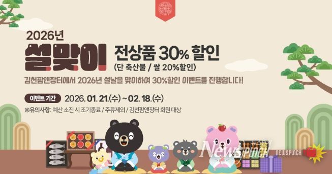 뉴스펀치 박세훈 기자 | 김천시는 설 명절을 맞아 농특산물 판로 확대와 농가의 부가가치 향상 및 소득 증대를 도모하기 위해, 1월 21일부터 2월 18일까지 시 대표 농특산물 온라인 쇼핑몰 ‘김천팜앤장터’에서 전 상품 할인 행사를 진행한다.