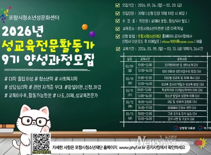 뉴스펀치 박세훈 기자 | 포항시청소년재단 청소년성문화센터는 오는 26일부터 내달 20일까지 청소년들의 건강한 성장을 돕고 올바른 성가치관을 전파할 ‘2026년 제9기 청소년 성교육 전문활동가 양성과정’ 교육생 30명을 모집한다.
