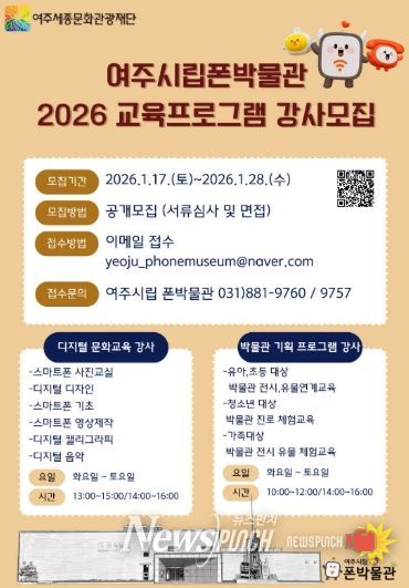 뉴스펀치 박상훈 기자 | 여주세종문화관광재단은 여주시립 폰박물관의 특성을 살린 디지털 문화교육 및 박물관 기획 교육 프로그램 운영을 위해 '2026 여주시립 폰박물관 교육 프로그램 강사'를 공개 모집한다.