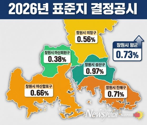 뉴스펀치 박세훈 기자 | 창원특례시는 2026년 표준지 공시지가가 전년 대비 평균 0.73% 상승했다고 밝혔다. 이는 전국 평균 상승률인 3.35%와 경상남도 평균 상승률 1.16%에 비해 낮은 수치로, 창원시의 지가 변동폭이 상대적으로 안정세를 유지하고 있는 것으로 나타났다.