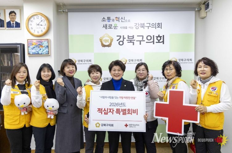 뉴스펀치 박상훈 기자 | 강북구의회는 지난 1월 22일 의장실에서 대한적십자사봉사회 강북구협의회 임원단과 간담회를 갖고, ‘2026년 적십자 특별회비’를 전달했다.