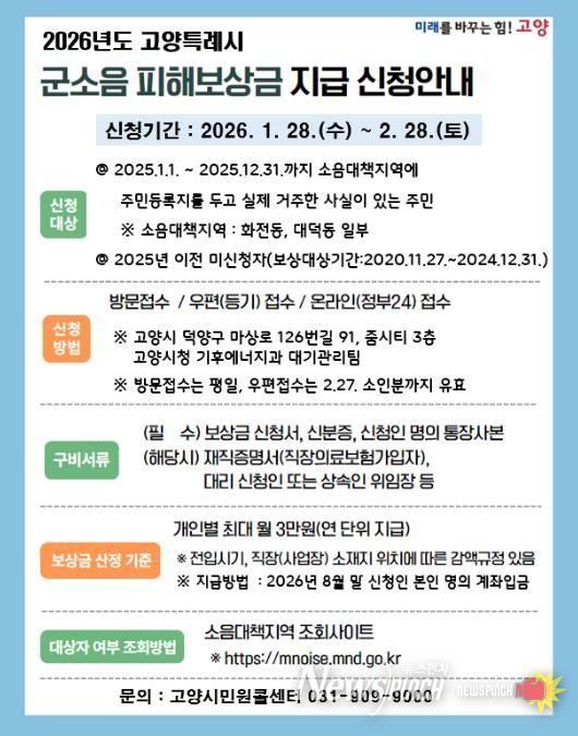 뉴스펀치 박상훈 기자 | 고양특례시는 오는 28일부터 2월 28일까지 군 소음대책지역에 대한‘2026년도 군소음 피해보상금 신청’을 받는다고 밝혔다.