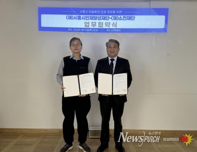 뉴스펀치 박상훈 기자 | 시흥시는 (재)시흥시인재양성재단이 지난 1월 22일 시흥시 미술 분야 유망 인재를 발굴하고 예술 교육 기반을 확대하기 위해 소전재단과 ‘미술 분야 장학생 발굴 및 프로그램 운영을 위한 상호협력 협약’을 체결했다고 밝혔다.