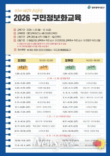 뉴스펀치 김용희 기자 | 광주 동구는 생활 속 디지털 활용 능력을 높여 주민들의 삶의 질을 향상시키기 위해 주민 맞춤형 정보화 교육인 ‘구민 정보화 교실’을 이달 26일부터 연중 운영한다고 밝혔다.