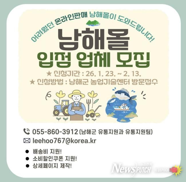 뉴스펀치 박세훈 기자 | 남해군이 지역 농수특산물과 관광상품의 온라인 시장 진출을 지원하고자 ‘남해몰’ 2026년 상반기 입점업체를 공개 모집한다고 밝혔다.