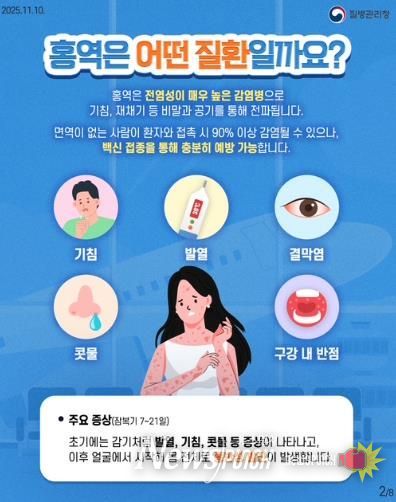홍역은 기침이나 재채기 등을 통해 공기로 전파되는 감염병으로 같은 공간에 잠시 머무는 것만으로도 감염될 수 있을 만큼 전염력이 매우 높다.
