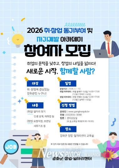 뉴스펀치 정홍균 기자 | 강화군 창업·일자리센터(센터장 오윤근)가 오는 2월 11일부터 ‘2026년 취‧창업 동기부여 및 자기 계발 아카데미’를 시작한다.