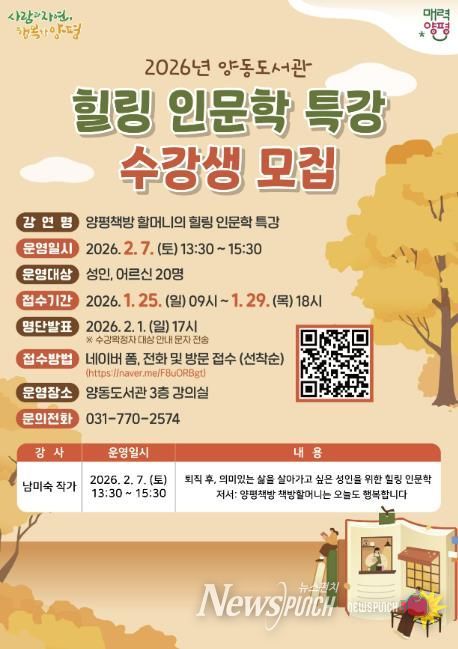 뉴스펀치 박상훈 기자 | 양평군은 새해를 맞아 양동도서관에서 오는 25일부터 29일까지 성인을 대상으로 한 ‘힐링 인문학 특강’ 수강생을 모집한다고 밝혔다.
