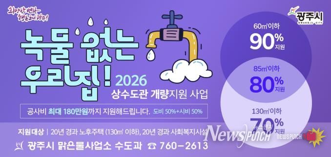 뉴스펀치 박상훈 기자 | 광주시는 깨끗하고 안전한 수돗물 공급을 위해 ‘녹물 없는 우리 집 수도관 개량 지원사업’을 추진한다고 23일 밝혔다.