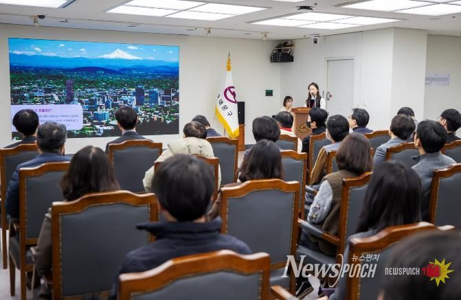 뉴스펀치 박상훈 기자 | 서울 동대문구는 22일 구청 5층 기획상황실에서 구청장과 전 직원을 대상으로 ‘2025년 포틀랜드 단기국외훈련 성과보고회’를 열고, 미국 포틀랜드주립대학교(PSU)에서 6개월간 진행된 훈련 결과를 공유했다. 구는 이번 보고회를 “해외 사례를 ‘구경’이 아니라 ‘적용 가능한 해법’으로 바꾸는 과정”에 초점을 맞춘 자리로 규정하며, 글로벌 감각과 창의적 문제 해결 역량을 행정 현장에 연결하겠다는 방침을 밝혔다.