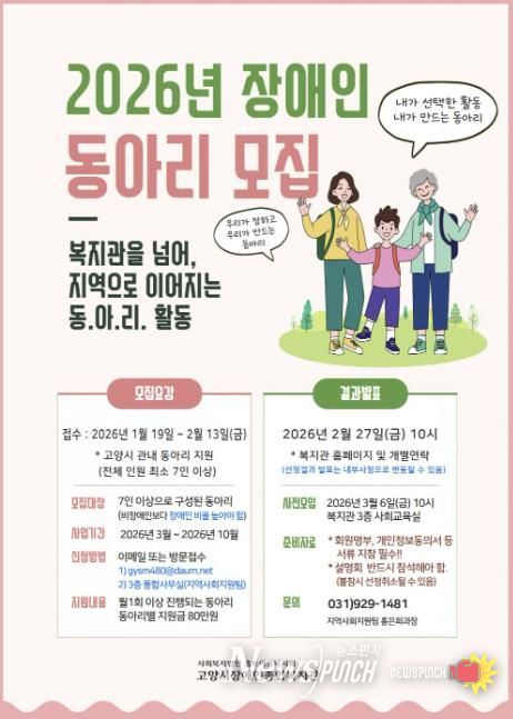 뉴스펀치 박상훈 기자 | 고양시장애종합복지관은 장애인이 주체가 되어 문화·여가 활동을 기획하고 운영할 수 있도록 지원하는 ‘2026년 장애인동아리지원사업’에 참여할 동아리를 모집한다.