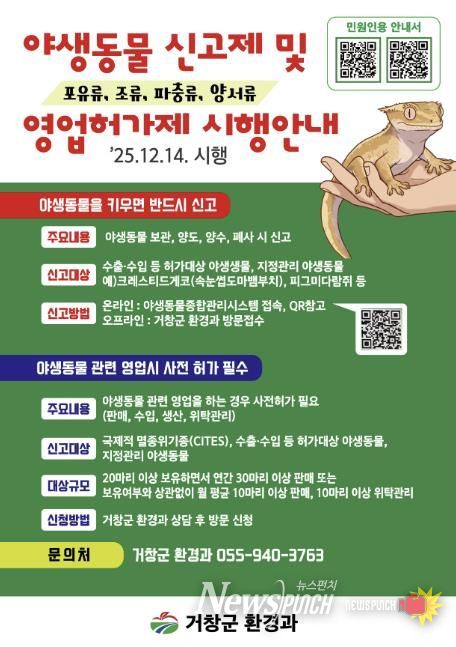 뉴스펀치 박세훈 기자 | 거창군은 체계적인 야생동물 관리와 책임 강화를 위해'야생동물 신고제 및 영업허가제'를 본격 시행한다.