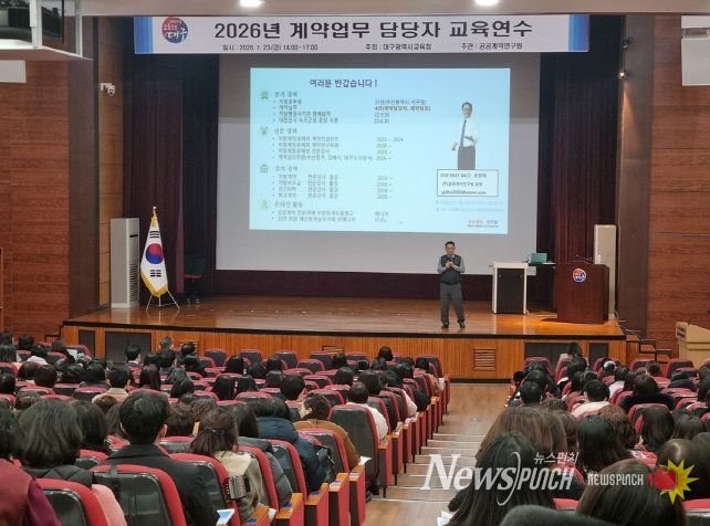 뉴스펀치 조평훈 기자 | 대구시교육청은 1월 23일 행복관에서 시교육청 산하 전 기관 계약업무 담당자 500여 명을 대상으로 실무 역량 강화를 위한 계약업무 담당자 연수를 실시하고, 계약업무 전문기관 활용 안내와 청렴 개선을 위한 당부 사항을 함께 전달한다.