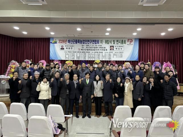 뉴스펀치 이현승 기자 | 예산군품목농업인연구연합회는 농업기술센터 교육관에서 연합회 임원과 회원 80명이 참석한 가운데 제10·11대 회장 이·취임식과 2026년 연시총회를 개최했다고 26일 밝혔다.
