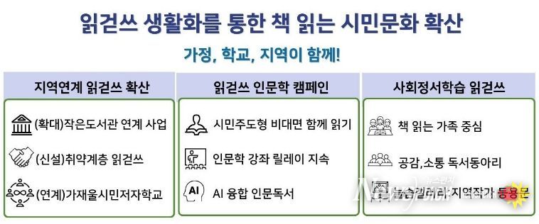 또한 생애주기별 맞춤 교육으로 ‘책 읽는 가족’ 문화 확산, 교과 연계 프로그램 강화, 독서·사유·실천을 잇는 인문학 캠페인을 중점 추진하여 지역과 연계한 ‘읽걷쓰’실천을 추진할 계획이다.