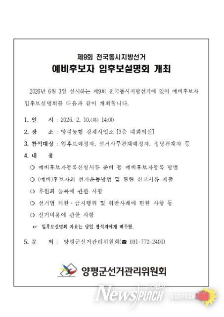뉴스펀치 박상훈 기자 | 양평군선거관리위원회는 2월 10일 14:00 양평농협 경제사업소 3층 대회의실에서 2026. 6. 3. 실시하는 제9회 전국동시지방선거와 관련하여 입후보예정자들에게 (예비)후보자등록 및 선거운동방법 등에 관한'예비후보자 입후보설명회'를 개최한다고 밝혔다.