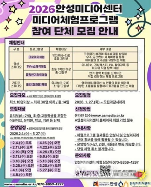 안성미디어센터 관계자는 “미디어체험은 아이들이 미디어를 가장 가까이에서 접하고 직접 표현해보는 중요한 과정”이라며 “올해는 더욱 체계적인 프로그램 운영과 다양한 콘텐츠로 지역 어린이와 청소년의 미디어 활용 역량을 높이겠다”고 말했다.