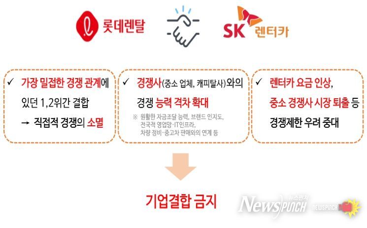 뉴스펀치 정홍균 기자 | 공정거래위원회는 사모펀드(PEF) 운용사인 어피니티 에쿼티 파트너스 리미티드가 롯데렌탈 주식회사의 주식 63.5%를 취득하는 기업결합을 심사한 결과, 국내 렌터카 시장의 가격 인상 등 경쟁을 실질적으로 제한할 우려가 크다고 판단하여 해당 결합을 금지하는 조치를 부과했다.