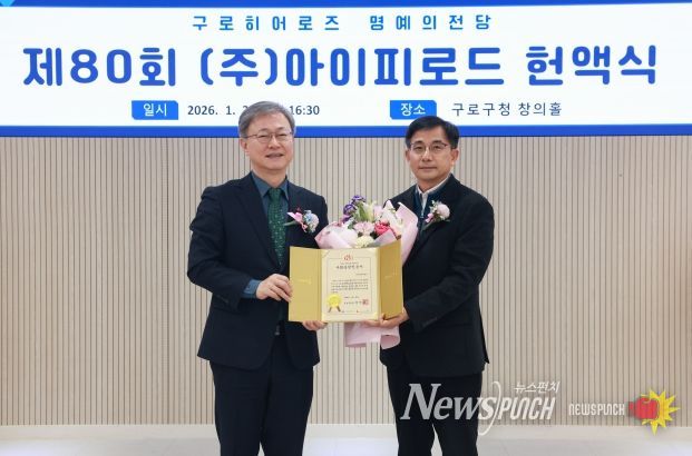 이날 장 구청장은 구청 창의홀에서 ㈜아이피로드(대표 강철지)에게 사회공헌 인증서를 전달하고, 본관 1층 명예의 전당에 제80호 구로히어로즈 명패를 등재했다.
