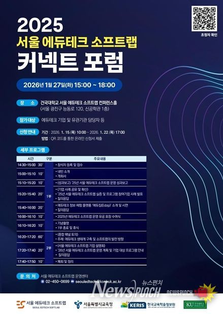 뉴스펀치 박상훈 기자 | 서울특별시교육청은 1월 27일 AI·디지털 기반 교육환경 지원 방안 모색을 위한‘서울 에듀테크 소프트랩 커넥트 포럼’을 개최한다.