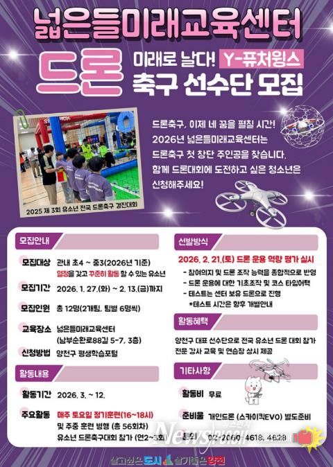 뉴스펀치 박상훈 기자 | 양천구는 드론 주행 기술과 스포츠를 결합한 유소년 드론축구단 ‘Y-퓨처윙스’를 창단하고, 하늘 위에서 펼쳐지는 짜릿한 승부를 함께 경험할 창립 멤버를 오는 2월 13일까지 모집한다고 밝혔다.