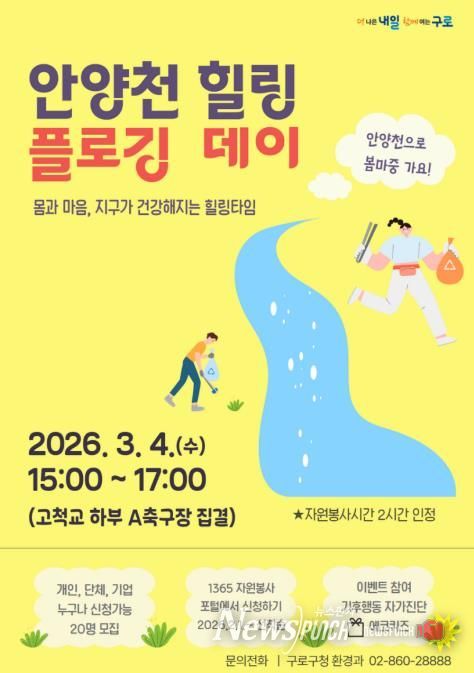 구로구 관계자는 “안양천 힐링 플로깅 데이를 통해 시민들이 일상에서 즐겁게 환경보호를 실천할 수 있을 것”이라며 “걷기만 해도 힐링이 되는 안양천에서 자연을 지키는 뜻깊은 활동에 많은 관심과 참여를 바란다”고 전했다.