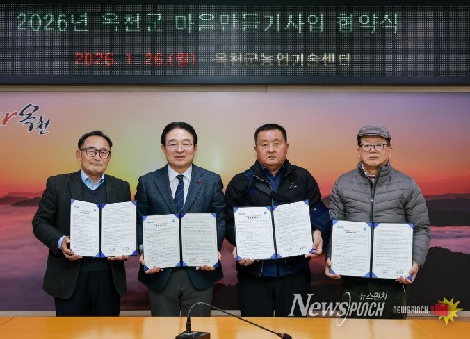 뉴스펀치 이현승 기자 | 옥천군은 1월 26일 오후 2시, 옥천군농업기술센터 2층 소회의실에서 ‘2026년 옥천군 마을만들기사업 협약식’을 열고 동이면 금암2리, 안남면 도덕1리, 청산면 한곡리 등 3개 마을과 협약을 체결했다.